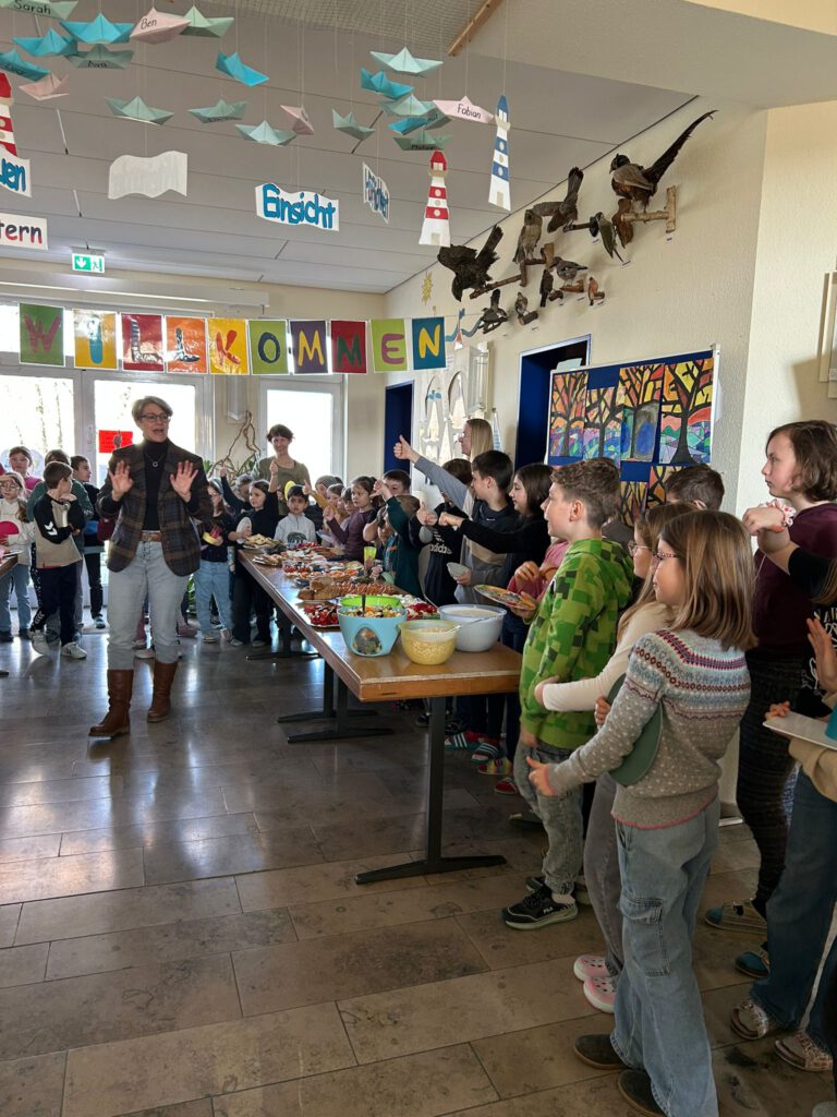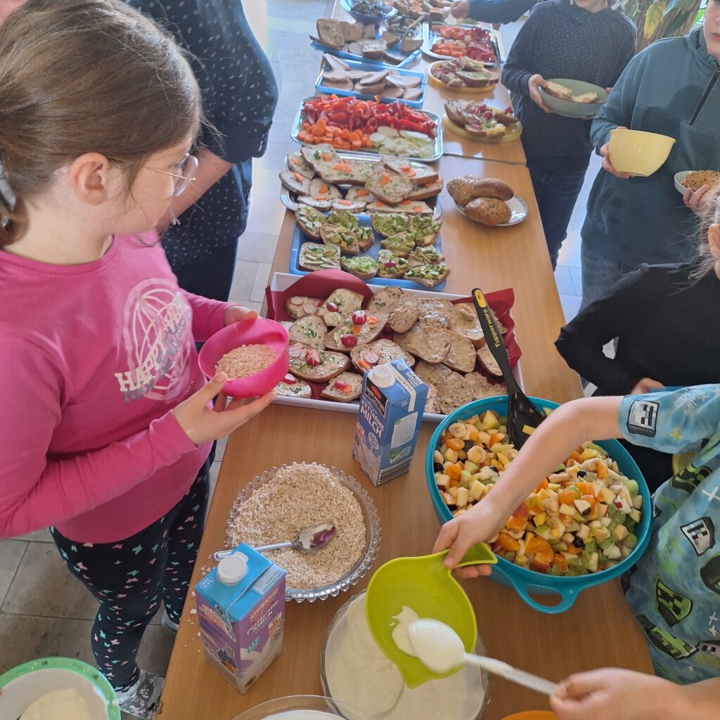 Am 25. November verwandelte sich unsere Aula in eine bunte Oase der gesunden Leckereien! Dank der tollen Organisation durch den Elternbeirat und der Unterstützung engagierter Mütter durften alle Kinder der Klassen 1 bis 4 ein abwechslungsreiches und ausgewogenes Frühstück genießen. Von knackigem Obst und Gemüse über leckere Vollkornbrote bis hin zu Joghurt und Müsli – für jeden Geschmack war etwas dabei. Die Kinder hatten nicht nur sichtlich Spaß, sondern lernten auch spielerisch, wie wichtig eine gesunde Ernährung ist.